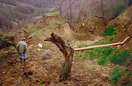 scivolamento superficiale planare dovuto all'erosione basale della valle da parte di scarichi fognari di acque bianche e nere. Lo scivolamento ha interessato parte della strada comunale